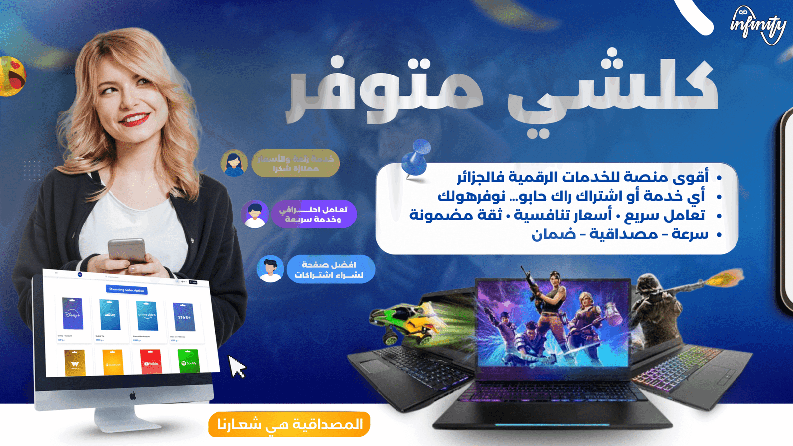 We also offer custom digital packs, SMM & marketing services, invoice systems, and secure payment methods via Baridimob, eCCP, CIB, Flexy (+15%), Binance Pay, and RedotPay, along with fast online checkout on infinitydzstore.com.